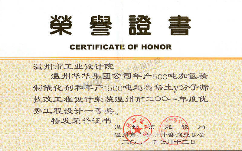 溫州華華集團公司年產(chǎn)500噸加氫精制催化劑和年產(chǎn)1500噸超穩(wěn)稀土Y分子篩技改工程設(shè)計 溫州市2001年度優(yōu)秀工程設(shè)計一等獎