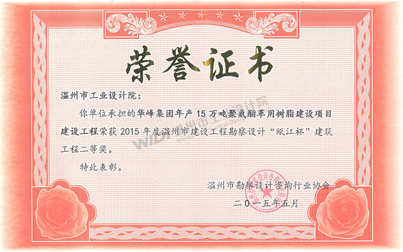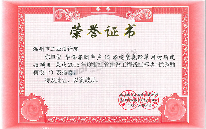 華峰集團(tuán)年產(chǎn)15萬噸聚氨酯革用樹脂建設(shè)項目建設(shè)工程 錢江杯表揚(yáng)獎